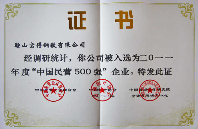 公司榮獲2011年“中國(guó)民營(yíng)500強(qiáng)”企業(yè)