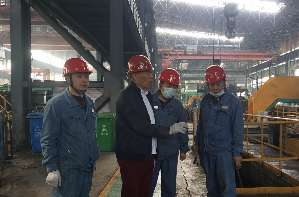 董事長(左二)在軋鋼廠檢修現(xiàn)場視察,公司副總經(jīng)理路士洪(右二)、軋鋼廠廠長馬振廣(右一)、軋鋼廠成品車間副主任李樹生(左一)等主要領(lǐng)導(dǎo)全程陪同