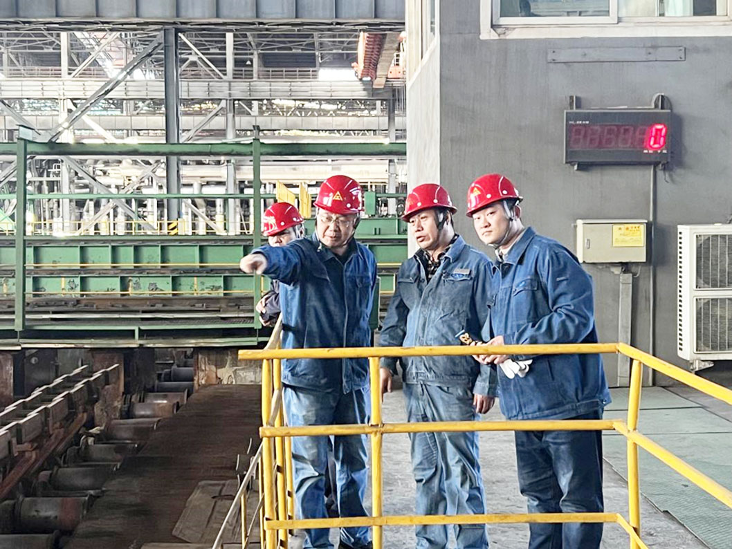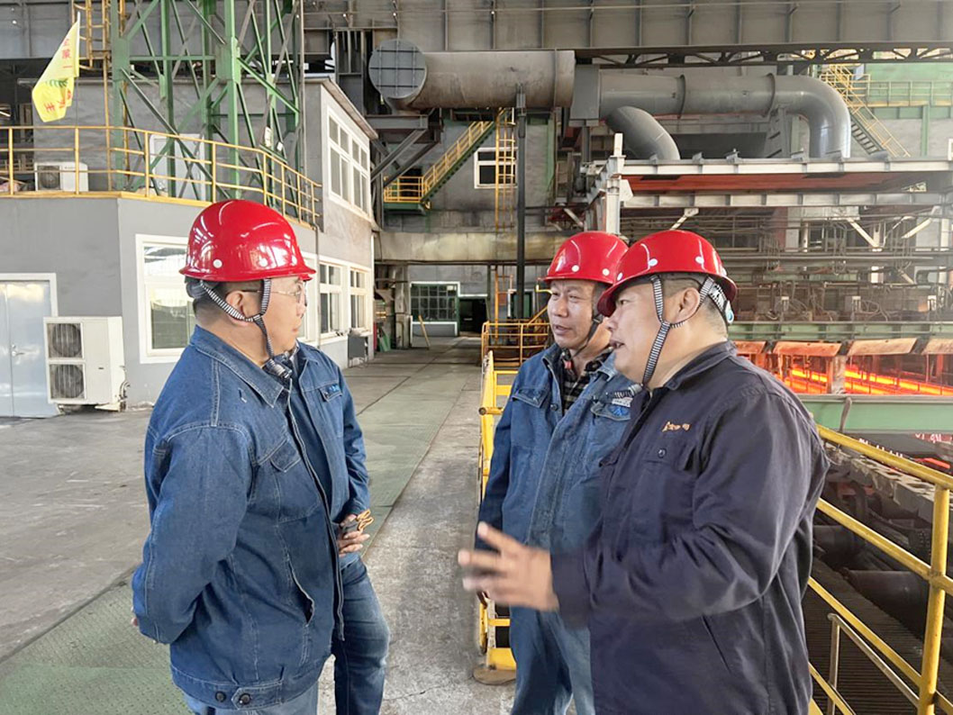 督導(dǎo)組組長楊殿新在煉鋼廠連鑄生產(chǎn)現(xiàn)場與公司生產(chǎn)經(jīng)理兼安全總監(jiān)陳旭東及煉鋼廠廠長閆海龍進行交流