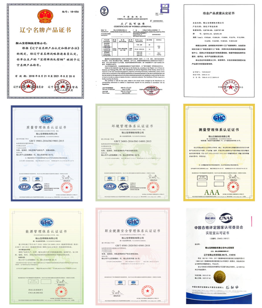 “寶得”牌鋼材以科學(xué)的管理,先進(jìn)的裝備,嚴(yán)格的檢測(cè)為保障,產(chǎn)品外型尺寸精度高,成分穩(wěn)定,性能可靠,表面質(zhì)量好,實(shí)物質(zhì)量高于國家標(biāo)準(zhǔn),達(dá)到發(fā)達(dá)國家同類產(chǎn)品水平,屢獲國家“冶金產(chǎn)品實(shí)物質(zhì)量金杯獎(jiǎng)” 和“遼寧省名牌產(chǎn)品”稱號(hào)。公司通過了GB/T 19001/ISO 9001質(zhì)量管理體系、GB/T 24001/ ISO 14001環(huán)境管理體系、GB/T 45001/ISO 45001職業(yè)健康安全管理體系、GB/T 23331 / ISO 50001和RB/T 103能源管理體系、GB/T 19022/ISO 10012測(cè)量管理體系審核認(rèn)證,獲得方圓標(biāo)志認(rèn)證中心頒發(fā)的“管理創(chuàng)新獎(jiǎng)”,取得國家船級(jí)社(CCS)的生產(chǎn)工廠認(rèn)可證書和遼寧省進(jìn)出口檢驗(yàn)檢疫局頒發(fā)的“產(chǎn)品出口免檢認(rèn)可證書”。